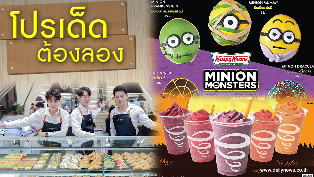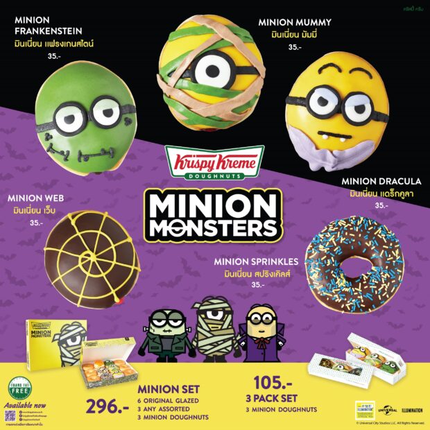 @ คริสปี้ ครีม ส่งก๊วนปิศาจมาป่วนหัวใจวันฮัลโลวีนด้วย “คริสปี้ ครีม มินเนี่ยน มอนสเตอร์” วายร้ายตัวจิ๋วความอร่อย 5 หน้าใหม่ นำทีมโดย “มินเนี่ยน แดร็กคูลา” มาพร้อมไส้บานาน่า วิปปิ้ง แน่นๆ ตามด้วย “มินเนี่ยน มัมมี่” สอดไส้ราสเบอร์รี่ รสเปรี้ยวอมหวาน, “มินเนี่ยน แฟรงเกนสไตน์” สอดไส้ช็อกโกแลต ฟัดจ์, “มินเนี่ยน เว็บ” กับไส้สตรอเบอรี่ ปิดท้าย “มินเนี่ยน สปริงเคิลส์” เคลือบหน้าช็อกโกแลตเข้มข้น โรยสปริงเคิลส์ เหลือง-ฟ้า สไตล์มินเนี่ยน ในราคาเพียงชิ้นละ 35 บาท ตั้งแต่วันที่ 11-31 ตุลาคม 2565 ดูรายละเอียดเพิ่มเติม www.krispykreme.co.th