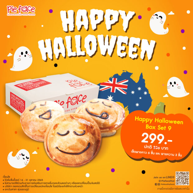 @ พาย เฟสซ์ ชวนทุกคนมาสนุกไปกับเทศกาลฮัลโลวีน ด้วยความอร่อยของพายกรอบนอกนุ่ม และความหรรษาไปกับรอยยิ้มของอีโมติคอนหน้าต่างๆ สัญลักษณ์แทนรสชาติหลากหลายความอร่อย พร้อมโปรโมชั่นสุดคุ้มกับ “Happy Halloween Box Set” ให้พร้อมปาร์ตี้ไปกับพาย เฟสซ์ 9 ชิ้น (พายรสคาว 6 ชิ้น และพายหวาน 3 ชิ้น) ในราคาเพียง 299 บาท (จากปกติ 336 บาท) ตั้งแต่วันนี้-31 ตุลาคม 2565 ที่ พาย เฟสซ์ทุกสาขา (ยกเว้นสาขาสุวรรณภูมิ) รายละเอียดเพิ่มเติม www.facebook.com/PieFaceThailand