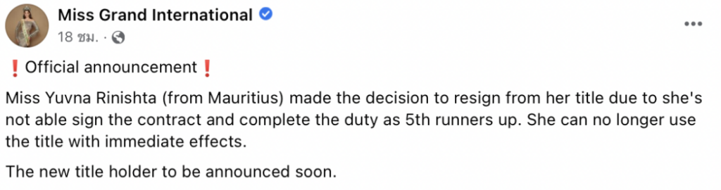 “Official announcement Miss Yuvna Rinishta (from Mauritius) made the decision to resign from her title due to she’s not able sign the contract and complete the duty as 5th runners up. She can no longer use the title with immediate effects.The new title holder to be announced soon.”