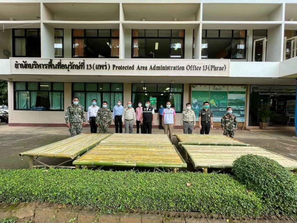 นายอิศเรศ สิทธิโรจนกุล ผู้อำนวยการสำนักบริหารพื้นที่อนุรักษ์ที่ 13 (แพร่) กรมอุทยานแห่งชาติ สัตว์ป่า และพันธุ์พืช พร้อมด้วยผู้อำนวยการส่วนอนุรักษ์สัตว์ป่า ผู้อำนวยการส่วนอุทยานแห่งชาติ ผู้อำนวยการส่วนอนุรักษ์และป้องกันทรัพยากร หัวหน้ากลุ่มวิชาการ หัวหน้าเขตห้ามล่าสัตว์ป่าช้างผาด่าน และเจ้าหน้าที่สำนักบริหารพื้นที่อนุรักษ์ที่ 13 (แพร่) ร่วมกันมอบเตียงไม้ไผ่ จำนวน 10 เตียง เพื่อนำไปสนับสนุนการปฏิบัติงานการดูแลรักษาผู้ป่วยโควิด-19 ในพื้นที่อำเภอลอง จังหวัดแพร่ โดยมี นายวีรพงษ์ ชมภูมิ่ง สาธารณสุขอำเภอลอง และเจ้าหน้าที่เป็นผู้รับมอบ
