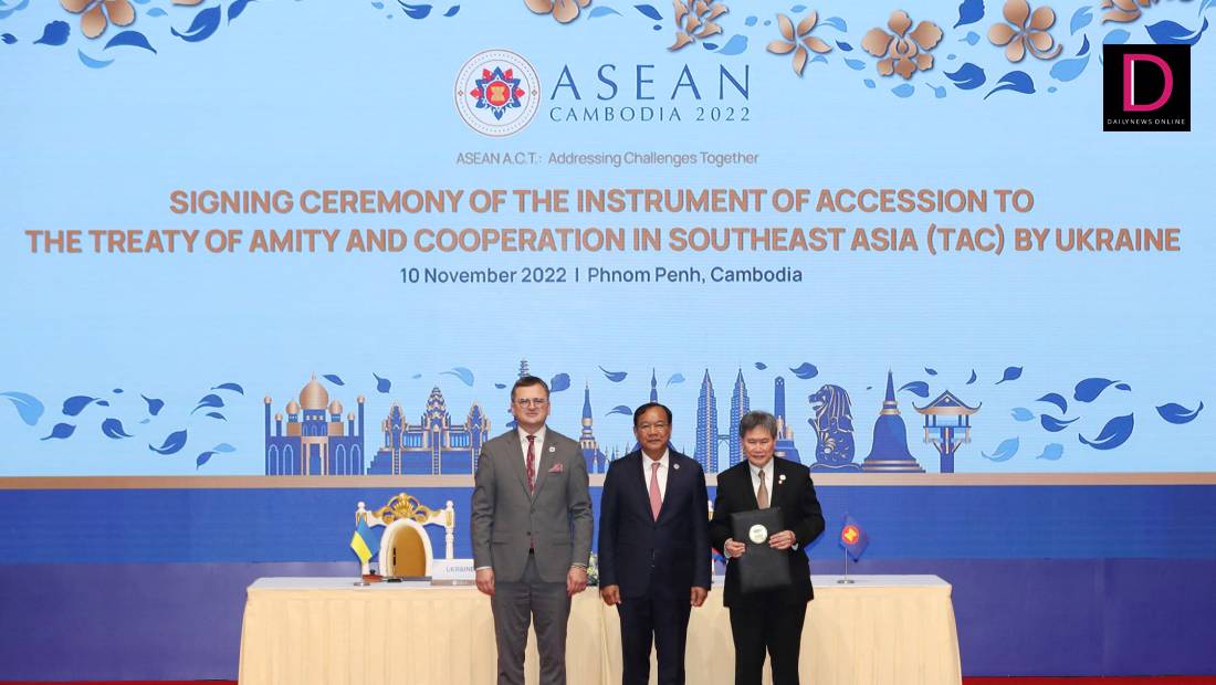 สำนักข่าวต่างประเทศรายงานจากกรุงพนมเปญ ประเทศกัมพูชา เมื่อวันที่ 10 พ.ย. ว่า นายดมิโทร คูเลบา รมว.การต่างประเทศยูเครน ลงนามในสนธิสัญญามิตรภาพและความร่วมมือในภูมิภาคเอเชียตะวันออกเฉียงใต้ (แทค) กับ นายลิ้ม จ็อก ฮอย เลขาธิการอาเซียน และ นายปรัก สุคน รมว.การต่างประเทศกัมพูชา ซึ่งทำหน้าที่ประธานอาเซียนประจำปีนี้ โดยพิธีดังกล่าวเกิดขึ้นที่กรุงพนมเปญ เมื่อวันพฤหัสบดี