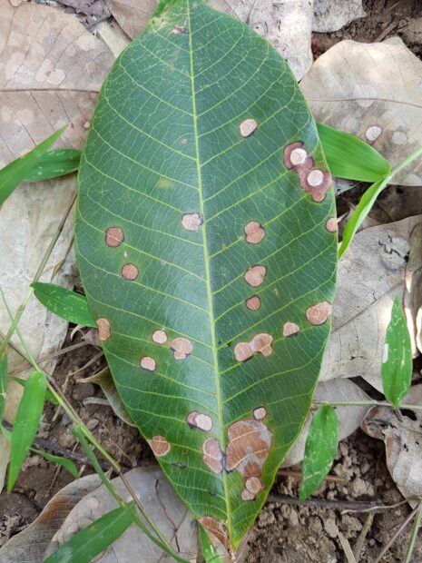 กรณีพบต้นยางพารามีทรงพุ่มไม่สดชื่น ใบร่วง ให้ตรวจสอบอาการของโรคบนใบ ซึ่งลักษณะเริ่มแรกจะเกิดรอยช้ำค่อนข้างกลมบริเวณใต้ใบ ผิวใบด้านบนของบริเวณเดียวกันเป็นสีเหลือง ต่อมาเนื้อเยื่อบริเวณนี้จะขยายใหญ่ขึ้นเป็นสีคล้ำขอบแผลดำ และกลายเป็นเนื้อเยื่อแห้ง สีน้ำตาลจนถึงขาวซีด รูปร่างแผลค่อนข้างกลม มีจำนวนจุดแผลมากกว่า 1 จุดบนใบ อาจเจริญลุกลามซ้อนกันเป็นแผลขนาดใหญ่ หากพบโรคใบร่วงชนิดใหม่ของยางพารา สามารถใช้ชีวภัณฑ์ควบคุมเชื้อราสาเหตุโรคที่สะสมอยู่ในดิน โดยใช้เชื้อราไตรโคเดอร์มาเพื่อกำจัดและควบคุมเชื้อราสาเหตุที่ยังคงมีชีวิตอยู่บนใบยางพาราที่ร่วงหล่นบริเวณพื้น สำหรับการหว่าน ใช้เชื้อสด 1 กิโลกรัม ผสมปุ๋ยอินทรีย์ 100 กิโลกรัม และรำ 4 กิโลกรัม อัตรา 5 – 7 กิโลกรัมต่อต้น หรือสำหรับการฉีดพ่น ให้ใช้เชื้อสด 1 กิโลกรัม ผสมน้ำหรือน้ำผสมน้ำหมักชีวภาพ 200 ลิตร อัตรา 5 – 7 ลิตรต่อต้น ทั้งนี้ ควรหว่านหรือฉีดพ่นให้เชื้อราไตรโคเดอร์มาครอบคลุมบนใบยางพาราที่ร่วงหล่นทั่วทั้งสวน ติดต่อกันอย่างต่อเนื่องทุก 3 เดือน