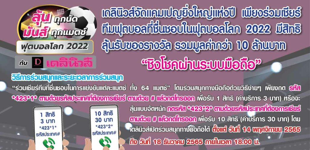 -สามารถร่วมสนุกผ่านทางโทรศัพท์มือถือได้ ตั้งแต่วันที่ 14 พฤศจิกายน ถึง วันที่ 18 ธันวาคม 2565 ภายในเวลา 18.00 น. โดยสามารถร่วมสนุกได้ทุกแมตช์ รวม 64 แมตช์ และยังลุ้นรับรางวัล ในการจับรางวัลในวันที่ วันที่ 29 ธันวาคม 2565 ณ สำนักงานใหญ่ หนังสือพิมพ์เดลินิวส์ ถนนวิภาวดีรังสิต กรุงเทพฯ และจะประกาศรายชื่อผู้โชคดีที่ได้รับรางวัล ทางหนังสือพิมพ์เดลินิวส์ ฉบับวันที่ 16 มกราคม 2566 และ ทาง www.dailynews.co.th ต่อไป