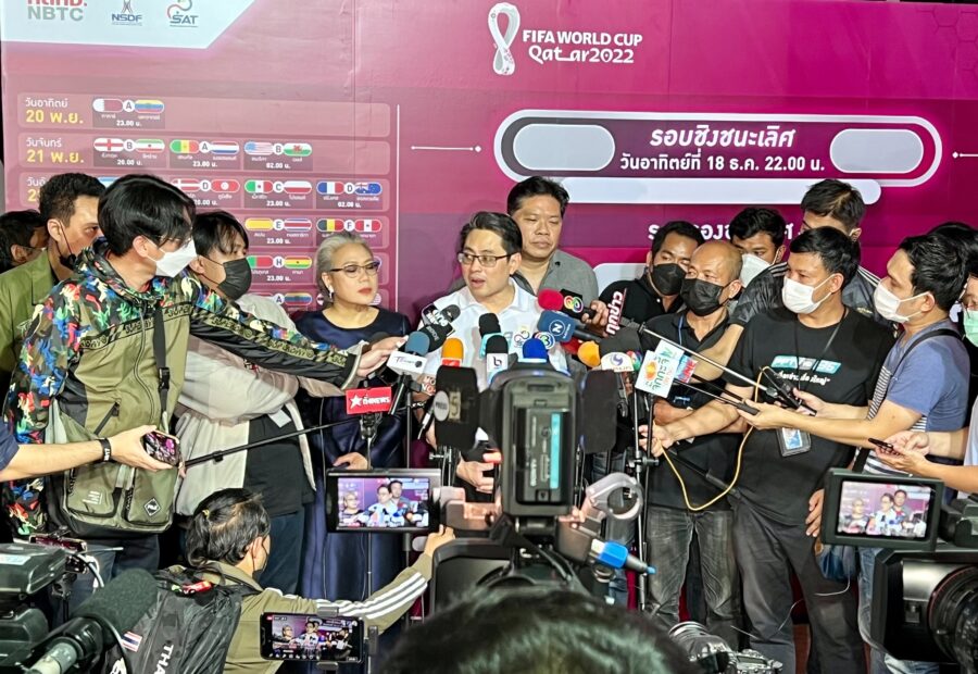 เมื่อวันที่ 20 พ.ย. ที่กรูฟแอทเซ็นทรัลเวิลด์ “บิ๊กก้อง” ดร.ก้องศักด ยอดมณี ผู้ว่าการการกีฬาแห่งประเทศไทย (กกท.) ในฐานะตัวแทนรัฐบาลไทย ได้แถลงข่าวขอบคุณผู้สนับสนุนการถ่ายทอดสดการแข่งขันฟุตบอลโลก กาตาร์ 2020 ทั้งในส่วนภาครัฐ โดยสำนักงานคณะกรรมการกิจการกระจายเสียง กิจการโทรทัศน์ และกิจการโทรคมนาคมแห่งชาติ และกองทุนพัฒนาการกีฬาแห่งชาติ ซึ่งมี พล.อ.ประวิตร วงษ์สุวรรณ รองนายกรัฐมนตรี เป็นประธานบอร์ดกองทุนพัฒนาการกีฬาแห่งชาติ และประธานบอร์ด กกท. ร่วมด้วยภาคเอกชน บริษัท ทรู คอร์ปอเรชั่น จำกัด (มหาชน), น้ำแร่ธรรมชาติ ตราช้าง, บริษัท ปตท. จำกัด (มหาชน), บริษัท ปตท. น้ำมันและการค้าปลีก จำกัด (มหาชน) หรือโออาร์, บริษัท ไทยออยล์ จำกัด (มหาชน), บริษัท โกลบอล เพาเวอร์ ซินเนอร์ยี่ จำกัด (มหาชน), บริษัท พลังงานบริสุทธิ์ จำกัด (มหาชน), ธนาคาร กสิกรไทย จำกัด (มหาชน) และ บริษัท บางจาก คอร์ปอเรชั่น จำกัด (มหาชน) ร่วมมอบความสุขให้คนไทย ได้ดูบอลโลกฟรีครบทั้ง 64 แมตช์