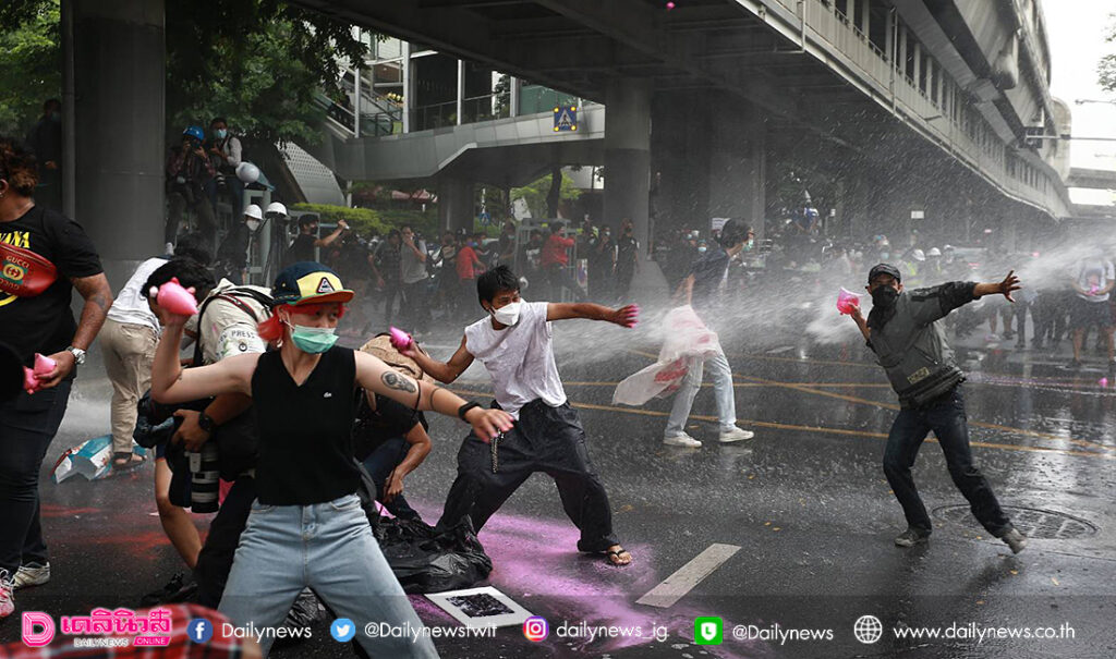 ขณะที่กลุ่มผู้ชุมนุมได้เริ่มทำลายป้ายผ้าพลาสติกสีฟ้าที่คลุมป้าย ตร.ไว้ออก ก่อนจะขว้างปาถุงสีชมพูใส่ป้ายสำนักงานตำรวจแห่งชาติ จนเป็นเต็มไปด้วยชมพู โดยเจ้าหน้าที่ได้ใช้ฉีดน้ำใส่กลุ่มผู้ชุมนุมเป็นระยะ แต่มวลชนยังไม่ยอมถอย และได้บีบแตรรถ จยย.เสียงดังไปทั่วบริเวณ ขณะที่บางส่วนมีการขว้างปาประทัดใส่บริเวณด้านหน้า ตร.สลับกับการกล่าวปราศรัยโจมตีรัฐบาล พล.อ.ประยุทธ์ ต่อเนื่อง