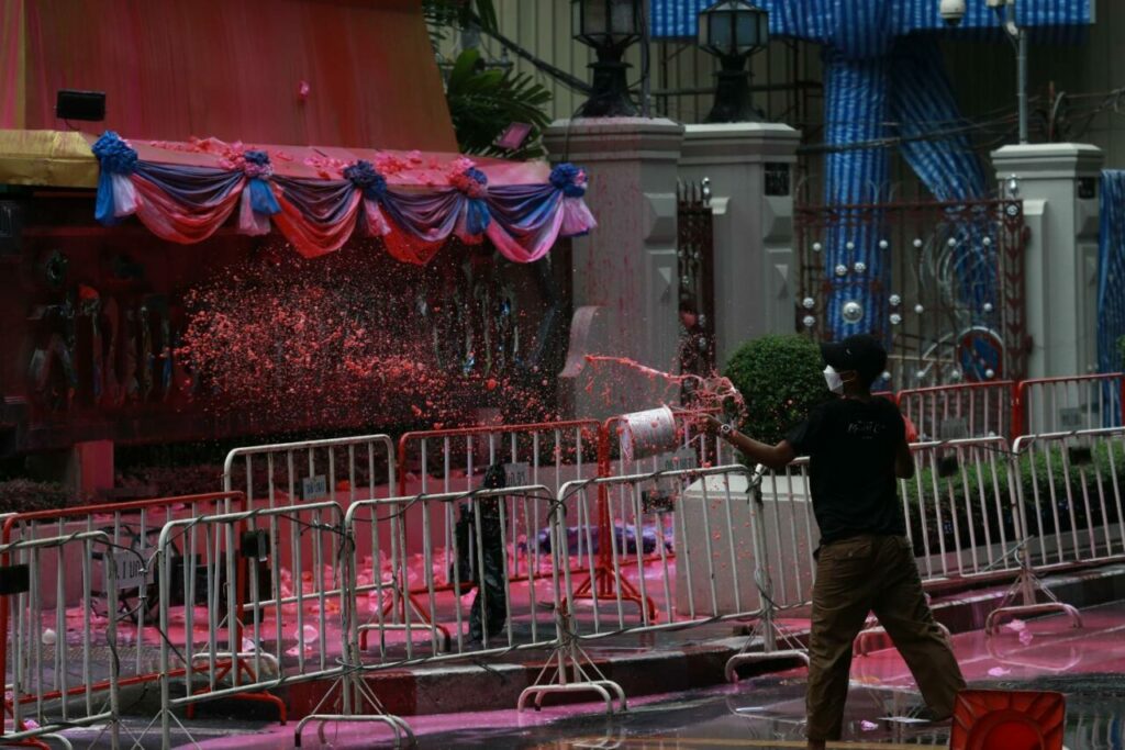 วันที่ 18 ส.ค. ที่สำนักงานตำรวจแห่งชาติ (ตร.) เจ้าหน้าที่จากสำนักเลขานุการ สำนักงานตำรวจแห่งชาติ, ตำรวจกองบัญชาการตำรวจสันติบาล และกลุ่มจิตอาสาจากพาณิชยการกรุงเทพ เข้าดำเนินการทำความสะอาดและปรับปรุงป้ายสำนักงานตำรวจแห่งชาติ และพระฉายาลักษณ์สมเด็จพระนางเจ้าสิริกิติ์ พระบรมราชินีนาถ พระบรมราชชนนีพันปีหลวง ที่ถูกผู้ชุมนุมกลุ่มทะลุฟ้าและเครือข่ายทำกิจกรรมแสดงออกเชิงสัญลักษณ์ด้วยการสาดสีและขว้างปาสิ่งของเข้าใส่จนได้รับความสกปรกเสียหายในบางส่วนเมื่อวานนี้ (17 ส.ค.) ซึ่งทางเจ้าหน้าที่ได้ทำนั่งร้านขึ้นไปทำความสะอาดและทาสีใหม่ ส่วนป้ายสำนักงานตำรวจแห่งชาติ หลังทำความสะอาดเบื้องต้นไปแล้วได้นำผ้าใบสีฟ้ามาคลุมทับไว้ชั่วคราว โดยเจ้าหน้าที่ได้เริ่มดำเนินการทำความสะอาดมาตั้งแต่ 08.00 น. และจะทำไปจนกว่าจะแล้วเสร็จ