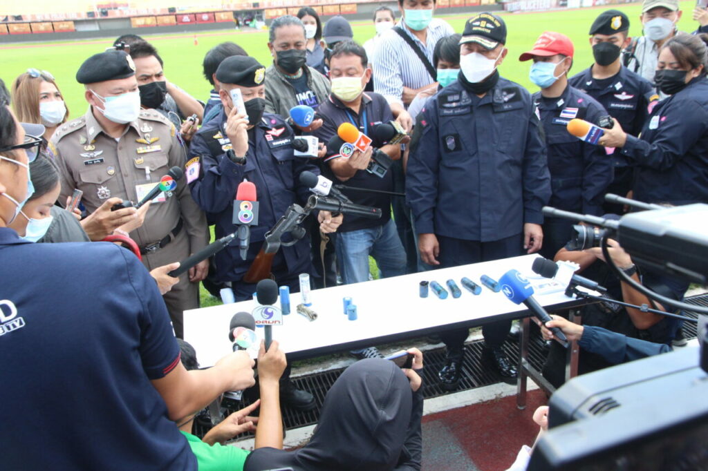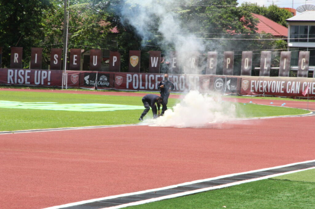 วันที่ 18 ส.ค. ที่สนามบุณยะจินดา พ.ต.ท.ศรายุทธ อรุณฉาย รอง ผกก.1 บก.อคฝ. ได้ทำการสาธิตวิธียิงแก๊สน้ำตา ICL-830 cartridge with tear gas projectile ขนาด 38 มม. แบบวิถีโค้ง เพื่อควบคุมฝูงชน จำนวน 3 นัด โดยกำหนดจุดตกบริเวณริมสนามฟุตบอล ห่างจากจุดยิงประมาณ 150 เมตร ผลการสาธิตกระสุนแก๊สน้ำตา ตกใกล้เคียงเป้าหมาย เนื่องจากมีผลกระทบจากกระแสลม