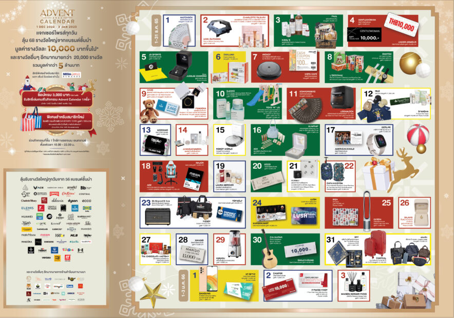 @ เมกาบางนา ร่วมเฉลิมฉลองเทศกาลแห่งความสุขกับแคมเปญ “ADVENT CALENDAR 2022” กิจกรรมแจกของขวัญส่งท้ายปี ให้ได้ลุ้นของรางวัลพิเศษได้ทุกวันกับทุกการชอปปิง ตั้งแต่วันที่ 1 ธันวาคม 2565-3 มกราคม 2566 เฉพาะสมาชิกเมกา สไมล์ รีวอร์ดส เพียงรับประทานอาหารหรือช้อปครบ 3,000 บาทขึ้นไปรับสิทธิเล่นเกม เพื่อลุ้นรับบัตรกำนัลและของรางวัลสุดเซอร์ไพร้ส์ พร้อมลุ้นรับรางวัลใหญ่ อาทิ บัตรกำนัลแทนเงินสด เซตเครื่องสำอาง เครื่องประดับ เครื่องใช้ไฟฟ้า ดูรายละเอียดเพิ่มเติม https://www.mega-bangna.com/