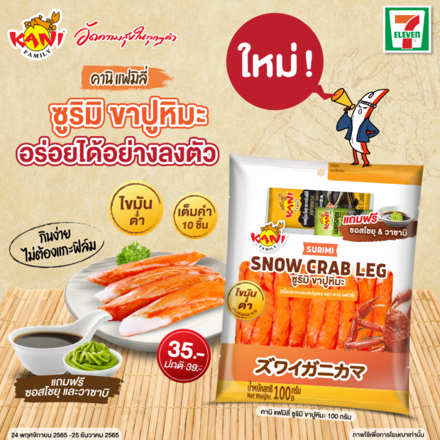 @ คานิ แฟมิลี่ ขอแนะนำผลิตภัณฑ์ใหม่ “ซูริมิ ขาปูหิมะ” พร้อมซอสโชยุและวาซาบิ ผลิตภัณฑ์เนื้อปลาทะเลบดปรุงรส ขึ้นรูปเป็นปูอัดคล้ายขาปูหิมะ มีแหล่งโปรตีนจากเนื้อปลาทะเล ไขมันต่ำ ทานง่ายไม่ต้องแกะฟิล์ม อร่อยเต็มคำ 10 ชิ้น พร้อมทานโดยไม่ต้องนำเข้าไมโครเวฟ ผ่านกรรมวิธีการผลิตที่ได้รับมาตรฐานสากล จัดจำหน่ายที่ 7-Eleven ทุกสาขา ขนาด 100 กรัม ราคาปกติ 39 บาท พิเศษ 35 บาท ตั้งแต่วันที่ 24 พฤศจิกายน 2565 ถึง วันที่ 25 ธันวาคม 2565