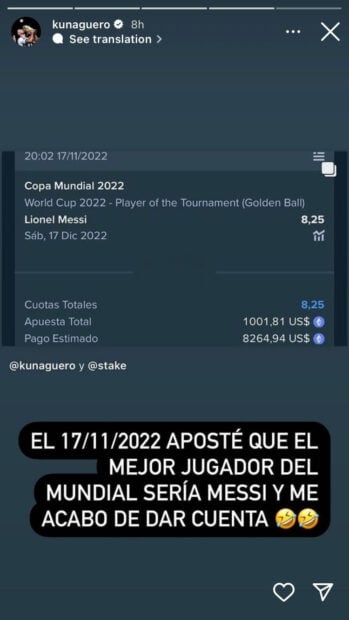 “เมื่อวันที่ 17 พ.ย. ผมวางเดิมพันเอาไว้ว่า เมสซี จะได้รางวัลนักเตะยอดเยี่ยมในฟุตบอลโลก และผมก็เพิ่งจะจำได้นี่แหละ” อเกวโร เผยพร้อมโชว์หลักฐานในการวางเดิมพันครั้งนี้ผ่านบัญชีอินสตาแกรมส่วนตัว.