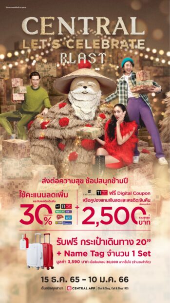 @ เซ็นทรัล ส่งมอบความสุขให้ลูกค้าอย่างต่อเนื่องจัดเต็มโปรโมชั่นและกิจกรรมตลอดช่วงเทศกาลเฟสทีฟ กับแคมเปญ “Central Let’s Celebrate Blast 2023” ชวนนักช้อป ส่งต่อความสุข ช้อปสนุกข้ามปี พบกับโปรโมชั่นสุดพิเศษ อาทิ รับคูปองส่วนลด สูงสุด 30%, ใช้คะแนนลดเพิ่มและรับเครดิตเงินคืน รวมสูงสุด 30%, รับ Digital Coupon หรือคูปองแทนเงินสดและเครดิตเงินคืนรวมสูงสุด 2,500 บาท, รับฟรี กระเป๋าเดินทางสุดลิมิเต็ดจากห้างเซ็นทรัล ขนาด 20 นิ้ว ตั้งแต่วันนี้-10 ม.ค.66 ที่ห้างเซ็นทรัลทั่วประเทศ รวมถึง Central App และทุกแพลตฟอร์มการช้อปของห้างเซ็นทรัล