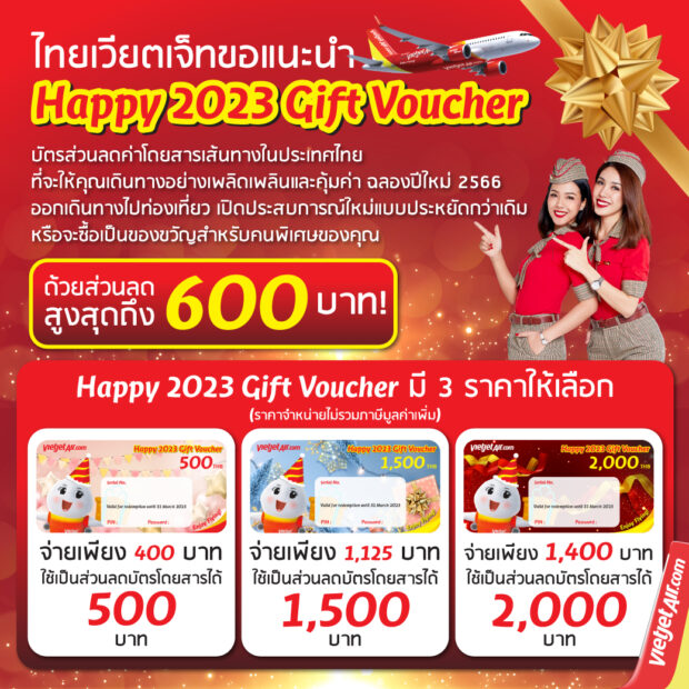 @ สายการบินไทยเวียตเจ็ท ร่วมส่งมอบความสุขในช่วงเทศกาลปีใหม่ เสนอบัตรกำนัล “Happy 2023 Gift Voucher” ใช้เพื่อเป็นส่วนลดบัตรโดยสารสูงสุดถึง 600 บาท สำหรับเดินทางบนทุกเส้นทางบินภายในประเทศและระหว่างประเทศ เพื่อให้ผู้โดยสารเดินทางอย่างคุ้มค่าหรือใช้เพื่อมอบเป็นของขวัญแก่คนสำคัญในช่วงเวลาพิเศษ บัตรกำนัลดังกล่าวราคาเริ่มต้นเพียง 400 บาท วางจำหน่ายและพร้อมให้แลกรับส่วนลดบัตรโดยสารตั้งแต่วันที่ 1 มกราคม 2566-31 มีนาคม 2566 เดินทางได้ระหว่างวันที่ 1 กุมภาพันธ์ 2566-30 กันยายน 2566 ที่ www.vietjetair.com