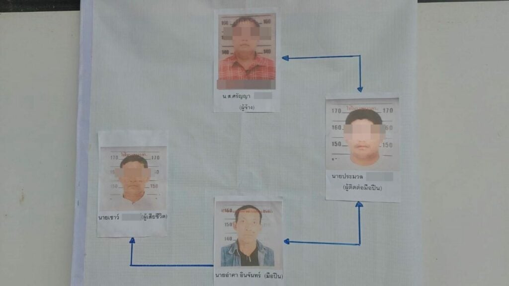 พล.ต.ต.อรรสิทธิ์ เผยอีกว่า นายประมวลจึงไปติดต่อกับ นายอำคา มือปืน ให้มาฆ่า นายเชาว์ ในราคา 5 หมื่นบาท แต่ก่อนไปจ้างวานฆ่า น.ส.ศรัญญา ได้ไปทำประกันชีวิตให้นายเชาว์ ถึง 5 ที่ด้วยกัน วงเงินประกันทั้งหมดรวม 2 แสนบาท ผู้เอาประกันคือ น.ส.ศรัญญา เอง กระทั่งวันเกิดเหตุ นายอำคา มือปืนขับรถยนต์มาจอดไว้ที่บ้านนายประมวล จากนั้นนายประมวล พานายอำคา ซ้อนท้ายรถจยย.ไปที่สวนมะขาม ห่างจากจุดเกิดเหตุ 500 เมตร ให้นายอำคา ซุ่มรอ กระทั่งผู้ตายขับรถยนต์กลับมา ขณะกำลังจอดรถ นายอำคา จึงใช้ปืนลูกซองสั้นไทยประดิษฐ์ ยิงนายเชาว์ จนรถเสียหลักไหลไปชนต้นไม้ ก่อนเปลี่ยนกระสุนเดินเข้าไปยิงซ้ำอีก 1 นัด จนแน่นิ่งแล้วเดินหลบหนีไปขึ้นรถจยย.นายประมวล ที่จอดรออยู่พาไปเอารถขับหลบไปที่บ้าน อ.หนองไผ่ จากนั้นหนีไปหลบซ่อนตัวที่เพิงพักในป่าข้าวโพด หมู่ 10 ต.น้ำร้อน อ.วิเชียรบุรี จ.เพชรบูรณ์ กระทั่งตำรวจสืบทราบและติดตามจับกุมตัวได้ดังกล่าว