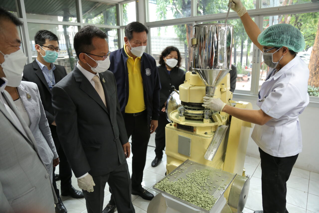 จากนั้นนายสมศักดิ์ และคณะได้เดินรับชมขั้นตอนการผลิต รวมทั้งได้ทดลองกินยาฟ้าทะลายโจรอัดเม็ดเพื่อยืนยันว่าสามารถกินได้จริง มีความสะอาดและปลอดภัยตามมาตรฐาน