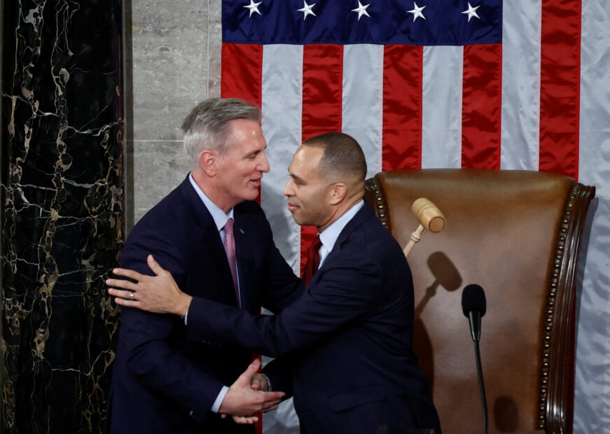 ทั้งนี้ แมคคาร์ธีกล่าวหลังนำสมาชิกสภาล่างชุดที่ 118 ทั้ง 435 ที่นั่ง สาบานตนเข้าปฏิบัติหน้าที่อย่างเป็นทางการ ว่า การรับตำแหน่งประธานสภาผู้แทนราษฎรในนามพรรครีพับลิกัน “คือการกลับมาของการถ่วงดุลอำนาจระหว่างฝ่ายนิติบัญญัติกับฝ่ายบริหาร” สื่อถึงการที่รัฐบาลวอชิงตันชุดปัจจุบันของประธานาธิบดีโจ ไบเดน เป็นพรรคเดโมแครต และแม้พรรคเดโมแครตกับพรรครีพับลิกัน มี 49 ที่นั่งเท่ากันในวุฒิสภา แต่วุฒิสมาชิกอิสระ 2 คน เป็นพันธมิตรกับพรรคเดโมแครตมากกว่า