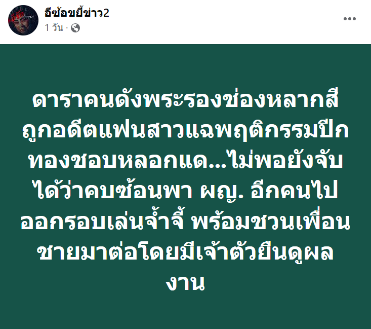 ทำเอาชาวเน็ตนั่งไม่ติดพร้อมกับฮือฮาอยู่ในขณะนี้ ภายหลังจากที่แฟนเพจชื่อดังอย่าง “อีซ้อขยี้ข่าว2” ได้ออกมาแฉพฤติดกรรมดาราดังรายหนึ่ง โดยระบุว่า “ดาราคนดังพระรองช่องหลากสี ถูกอดีตแฟนสาวแฉพฤติกรรมปีกทองชอบหลอกแด…ไม่พอยังจับได้ว่าคบซ้อนพา ผญ. อีกคนไปออกรอบเล่นจ้ำจี้ พร้อมชวนเพื่อนชายมาต่อโดยมีเจ้าตัวยืนดูผลงาน”
