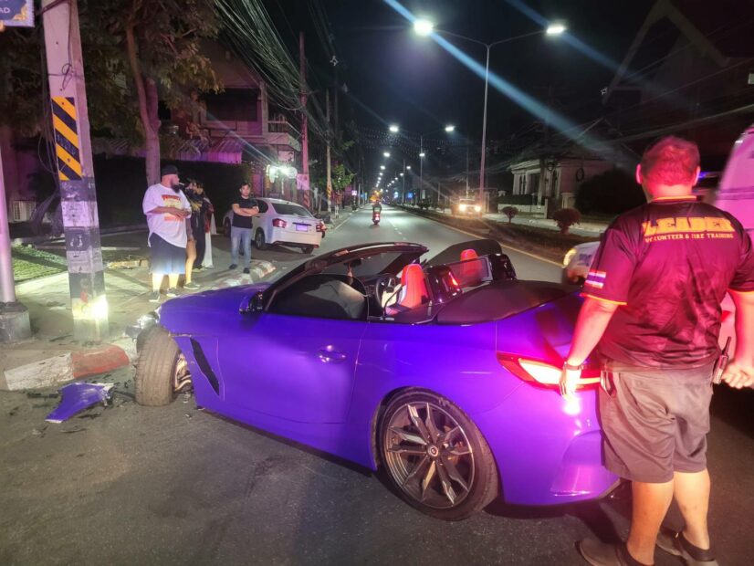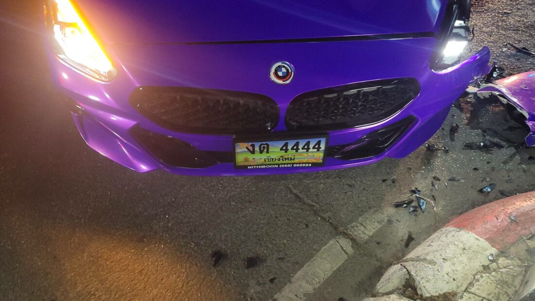 ที่เกิดเหตุพบรถสปอร์ตหรู เปิดประทุน ยี่ห้อ BMW รุ่น Z4 สีม่วง หมายเลขทะเบียน งต 4444 เชียงใหม่ จอดขวางถนนอยู่ โดยมีร่องรอยการเฉี่ยวชนบริเวณด้านหน้าข้างซ้าย พังเสียหายยับเยิน โดยจากการตรวจสอบเจ้าหน้าที่พบ ผู้ขับขี่เป็นหญิงสาวไม่ทราบชื่อ หน้าตาดี อายุประมาณ 25 ปี นั่งอยู่บริเวณเบาะคนขับ อยู่ในสภาพพูดจาสับสน ทางเจ้าหน้าที่จึงได้นำตัวส่งโรงพยาบาล เพื่อทำการตรวจเช็กอาการ