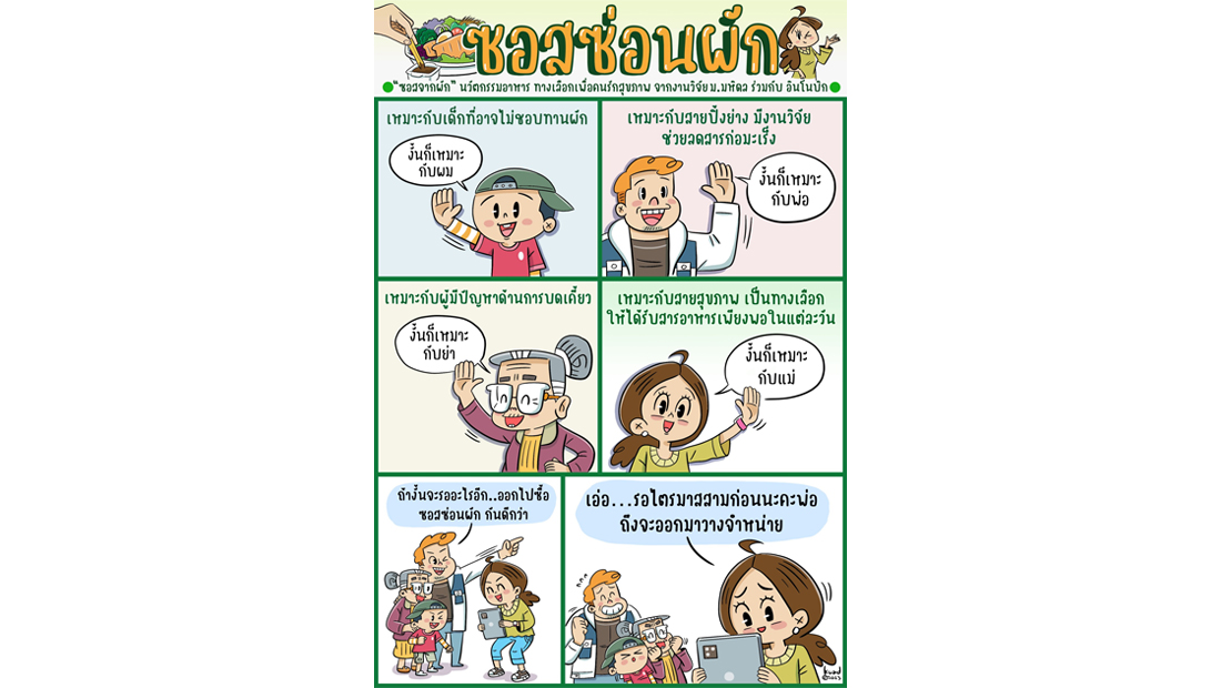 ผักนับเป็นอาหารที่มีประโยชน์และมีความจำเป็นอย่างมาก เพราะผักเป็นแหล่งที่สำคัญของวิตามิน เกลือแร่ และที่สำคัญคือเป็นแหล่งสำคัญของใยอาหารที่ช่วยในการขับถ่ายให้ขับถ่ายได้สะดวก ไม่มีปัญหาท้องผูก แต่ด้วยรสชาติของผักที่อาจมีรสขม หรือลักษณะเป็นชิ้นแข็ง เคี้ยวได้ยาก ทำให้คนส่วนใหญ่ไม่ชอบการกินผัก แต่ปัญหาเหล่านี้จะลดลงและเพื่อเป็นการเพิ่มทางเลือกการทานอาหารให้กับคนไทยทุกวัย ด้วย “ซอสซ่อนผัก” และ “ซอสซ่อนผักสูตรเด็ก”