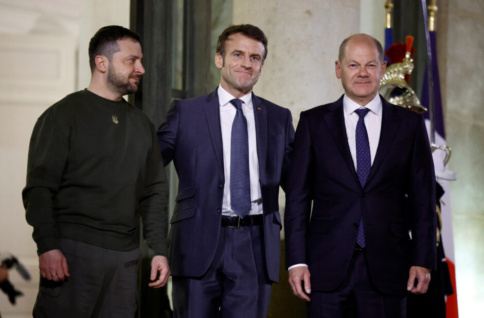หลังจากนั้น เซเลนสกีเดินทางต่อไปยังกรุงปารีส เพื่อพบหารือกับประธานาธิบดีเอ็มมานูเอล มาครง ผู้นำฝรั่งเศส และนายกรัฐมนตรีโอลาฟ โชลซ์ ผู้นำเยอรมนี ซึ่งผู้นำยูเครนเดินหน้าเรียกร้องขอความสนับสนุนด้านอาวุธยุทโธปกรณ์จากยุโรปเพิ่มเติมอีก โดยเฉพาะอาวุธโจมตีระยะไกลและรถถังประจัญบาน และ “ความคืบหน้า” ของการเจรจา เพื่อรับยูเครนเข้าเป็นสมาชิกใหม่ของสหภาพยุโรป (อียู)