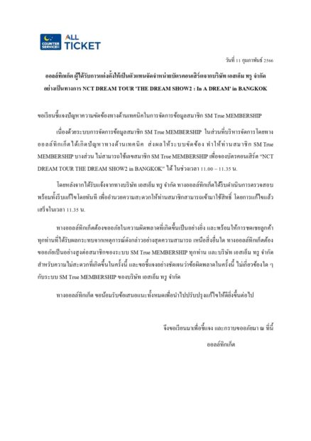 เนื่องด้วยระบบการจัดการข้อมูลสมาชิก SM Tre MEMBERSHIP ในส่วนที่บริหารจัดการโดยทางออลล์ทิกเก็ตได้เกิดปัญหาทางด้านเทคนิค ส่งผลให้ระบบขัดข้อง ทำให้ท่านสมาชิก SM True MEMBER SHIP บางส่วน ไม่สามารถใช้เลขสมาชิก SM True MEMBERSHIP เพื่อจองบัตรคอนเสิร์ต “NCT DREAM TOUR THE DREAM SHOW2 in BANGKOK” ได้ ในช่วงเวลา 11.00-11.35 น.