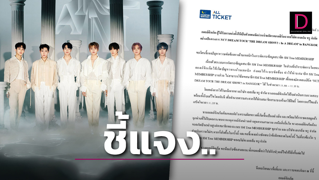 เกี่ยวกับเรื่องดังกล่าว ทางด้าน “All Ticket” ตัวแทนจำหน่ายบัตรคอนเสิร์ต ได้ออกมาชี้แจงถึงเรื่องราวที่เกิดขึ้น ระบุว่า “ออลล์ทิกเก็ต ผู้ได้รับการแต่งตั้งให้เป็นตัวแทนจัดจำหน่ายบัตรคอนเสิร์ตจากบริษัท เอสเอ็ม ทรู จำกัด อย่างเป็นทางการ NCT DREAM TOUR ‘THE DREAM SHOW2 : In A DREAM’ in BANGKOK ขอเรียนชี้แจงปัญหาความขัดข้องทางด้านเทคนิคในการ จัดการข้อมูลสมาชิก SM True MEMBERSHIP”