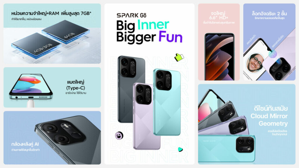 @ เทคโน ประเทศไทย ขอประเดิมส่งความสดใสในดีไซน์ แต่อัดแน่นด้วยสเปคเทพ จัดเต็มทุกความคุ้มค่ากับ “SPARK Go 2023” สมาร์ทโฟนรุ่นใหม่ ที่มาพร้อมความจุขนาดใหญ่ ขยาย RAM ได้สูงสุด 7GB ใช้งานได้สนุกมากขึ้น หน่วงน้อยลง พร้อมเก็บภาพความทรงจำของปี 2566 ได้จุใจใน ROM ความจุ 64GB มาพร้อมกับแบตเตอรี่ความจุใหญ่ 5,000 mAh ชาร์จไว 10W ดีไซน์ทันสมัย Cloud Mirror Geometry โดยมีให้เลือก 2 รุ่น ได้แก่ รุ่น 3GB + 64GB และรุ่น 4GB + 64GB สนใจรายละเอียดคลิก