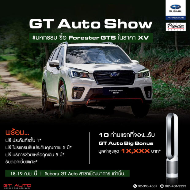 @ GT Auto มอบข้อเสนอสุดพิเศษแห่งปีก่อนใคร สำหรับผู้ซื้อรถยนต์ “Subaru Forester GTS” ระหว่างวันที่ 18-19 กุมภาพันธ์ 2566 นี้ ณ โชว์รูม Subaru GT Auto สาขาพัฒนาการ อาทิ รับส่วนลดพิเศษ On-Top, รับดอกเบี้ยพิเศษ, ฟรี ประกันภัยชั้น 1, ฟรี โปรแกรมรับประกันคุณภาพตัวรถ (Warranty) นาน 5 ปี, ฟรี โปรแกรมช่วยเหลือฉุกเฉิน ตลอด 24 ชั่วโมง (Roadside Assistance) นาน 5 ปี และพิเศษลูกค้า 10 ท่านแรกรับทันที GT Auto Big Bonus มูลค่าสูงสุด 13,900 บาท สนใจสอบถามเพิ่มเติมโทร. 0-2318-4567, 08-1401-9999