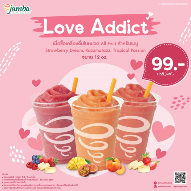@ Jamba ชวนบอกรักแบบสุขภาพดี ด้วยโปรโมชั่นสุดพิเศษ “Love Addict” ให้อร่อยกับน้ำผลไม้แท้ในเมนู Strawberry Dream, Razzmatazz และ Tropical Passion ขนาด 12 Oz. ในราคาพิเศษ 99 บาทเท่านั้น (จากราคาปกติ 115 บาท) ตั้งแต่วันนี้-31 มีนาคม 2566 ที่ร้านแจมบาร์ทุกสาขาใกล้บ้าน (ศูนย์การค้าเซ็นทรัลพลาซ่าลาดพร้าว บริเวณชั้น 2, ศูนย์การค้าสามย่านมิตรทาวน์ ชั้น B1, ศูนย์การค้าแอมไชน่าทาวน์ ชั้น G และศูนย์การค้าเซ็นทรัลเฟสติวัล พัทยา บีช ชั้น G,) ติดตามความเคลื่อนไหวได้ที่ www.facebook.com/jambajuicethailand