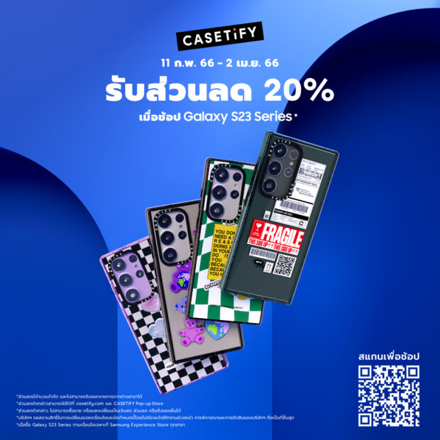 @ ซัมซุง จับมือ CASETiFY แบรนด์เคสสมาร์ทโฟนสำหรับวัยรุ่น Gen Z มอบส่วนลด 20% ให้กับลูกค้าทุกคนที่ซื้อสมาร์ทโฟน “Galaxy S23 Series” ผ่านSamsung Experience Store โดยสามารถใช้ส่วนลดเพื่อซื้อเคสได้ ผ่าน casetify.com และ CASETiFY Pop-up Store เซ็นทรัลเวิลด์ ชั้น 1 โซน Atrium ตั้งแต่วันที่ 11 กุมภาพันธ์-31 มีนาคม 2566 นี้เท่านั้น รายละเอียดเพิ่มเติมคลิก https://www.samsung.com/th/smartphones/galaxy-s23-ultra/