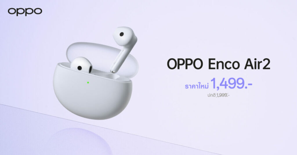 @ OPPO ขอแนะนำ “OPPO Enco Air2” หูฟังไร้สายเสียงทรงพลัง มาพร้อมเสียงระดับคุณภาพ กระจ่างชัดและใสดุจคริสตัล ด้วยการใช้ฮาร์ดแวร์ที่โดดเด่นอย่าง Composite Titanized Diaphragm Driver ขนาด 13.4 มม. พร้อมเสียงสเตอริโอใหม่ Bass Boostมาในดีไซน์โดดเด่นด้วยเคสชาร์จแบบโปร่งแสง สวมใส่สบาย ใช้งานยาวนาน ชาร์จเร็ว ประสิทธิภาพสูง ในราคาใหม่เพียง 1,499 บาท จากราคาปกติ 1,999 บาท ตั้งวันนี้เป็นต้นไปที่ OPPO Brand Shop และตัวแทนจำหน่ายที่ร่วมรายการ