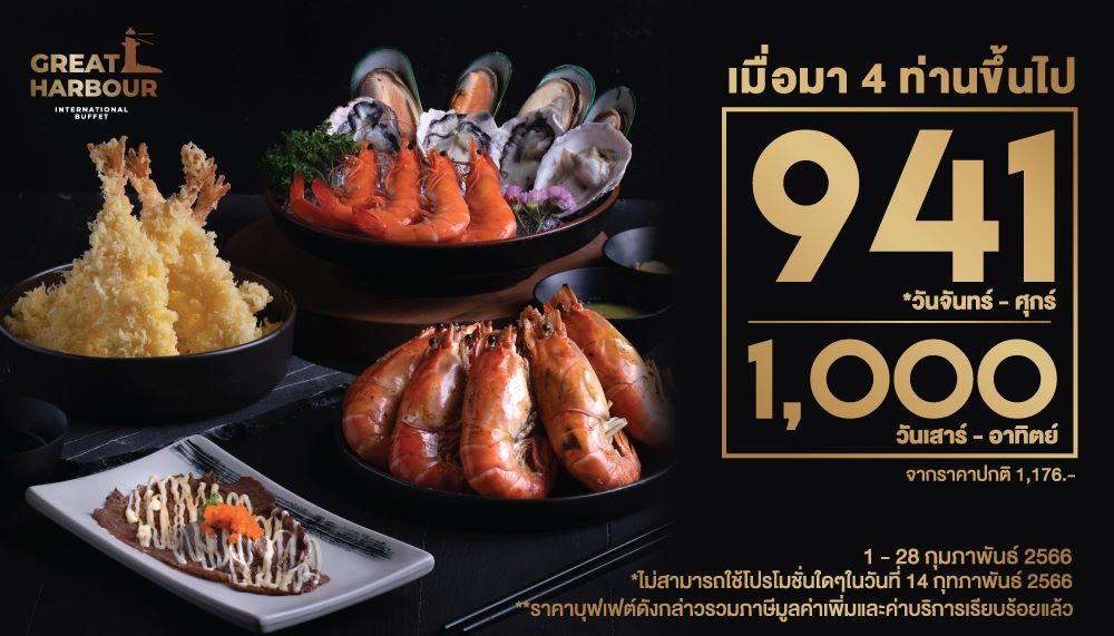 @ Great Harbour ชวนทุกคนมาดื่มด่ำกับความอร่อยกับบุฟเฟต์นานาชาติ กว่า 80 เมนู ไม่ว่าจะเป็น เมนูเริ่มต้นสุดคลาสสิกทั้งในแบบตะวันตก อาทิ ชุดชีสบอร์ดเรียกน้ำย่อยจากที่รวมความอร่อยของชีสนานาชนิด และเครื่องเคียงแสนอร่อยหรือซุปเห็ดทรัฟเฟิลกลมกล่อม สุดเข้มข้น และในแบบเอเชีย ไม่ว่าจะเป็น เครปเป็ด สูตรเฉพาะที่ไม่เหมือนใคร หรือหลากหลายเมนูซาซิมิ และซูชิ และพลาดไม่ได้กับขบวนการความหวานสุดอลังการแบบไม่อั้น กับ โปรโมชั่นชุดพิเศษ เพียงมา 4 ท่านขึ้นไป จ่ายเพียง 941 บาทต่อท่านในวันจันทร์-ศุกร์ หรือ เพียง 1,000 บาทต่อท่าน ในวันเสาร์-อาทิตย์ สอบถามรายละเอียดได้ที่ Facebook : Great Harbour หรือ Line : @harbour