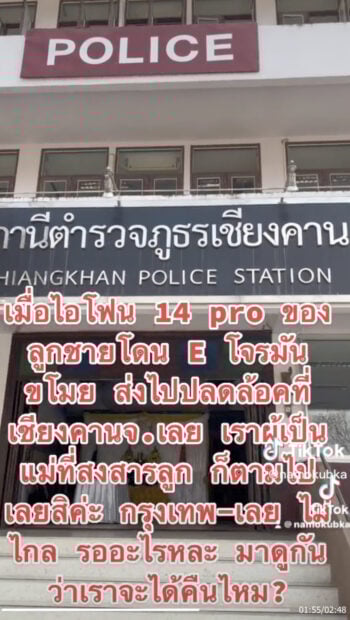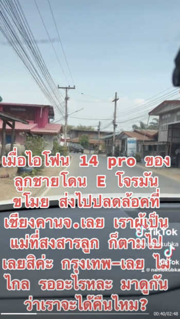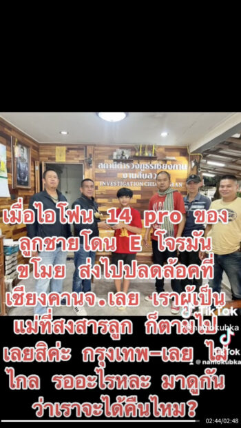 ‘ไอโฟนถูกขโมย ตามมาได้ เครื่องไม่ใช่บาท สองบาทนะ อย่าปล่อยให้โจรลอยนวล…เมื่อไอโฟน 14 pro ของลูกชายโดนขโมย ส่งไปปลดล็อกที่เชียงคาน จ.เลย เราผู้เป็นแม่ที่สงสารลูก ก็ตามไปเลยสิคะ กรุงเทพฯ-เลย ไม่ไกล รออะไรล่ะ ไปดูกันว่าเราจะได้คืนมั้ย?’