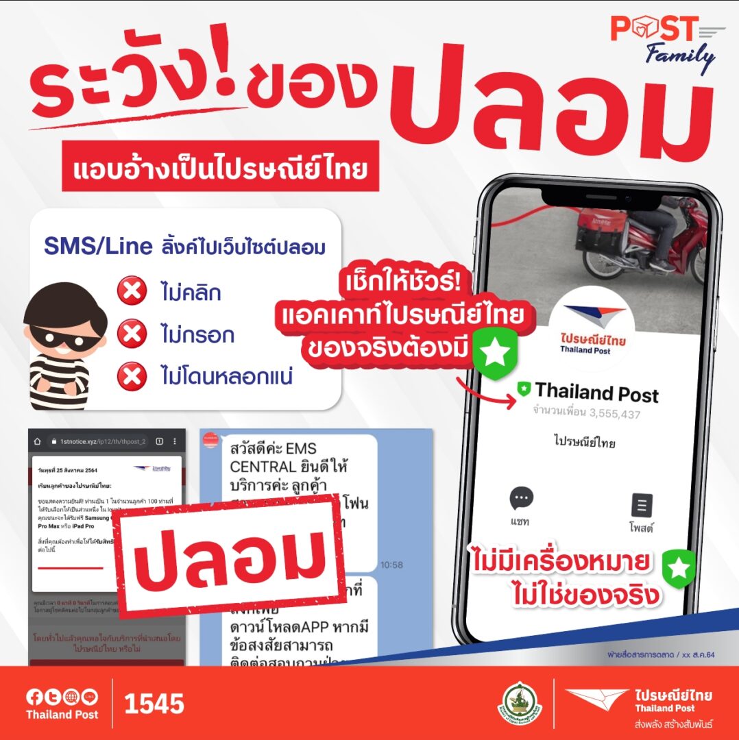 ทั้งนี้ ในการติดต่อกับสมาชิกของไปรษณีย์ไทย จะดำเนินการผ่านระบบภายใต้ชื่อ POST Family (โพสต์แฟมิลี่) ผ่าน Line@Thailandpost, SMS ชื่อ THPost และ อีเมลชื่อ [email protected] เท่านั้น จึงขอความกรุณาผู้ใช้บริการสังเกตชื่อที่ถูกต้องให้แน่ใจทุกครั้งก่อนตัดสินใจกดลิงค์ สมาชิกสามารถเข้าสู่ระบบเพื่อตรวจสอบยอดคะแนนสะสม สิทธิพิเศษและโปรโมชันต่างๆได้ตามช่องทางดังกล่าว และทางเว็บไซต์ https://postfamily.thailandpost.com หากมีข้อสงสัยสามารถสอบถามเพิ่มเติมได้ที่ THP Contact Center 1545