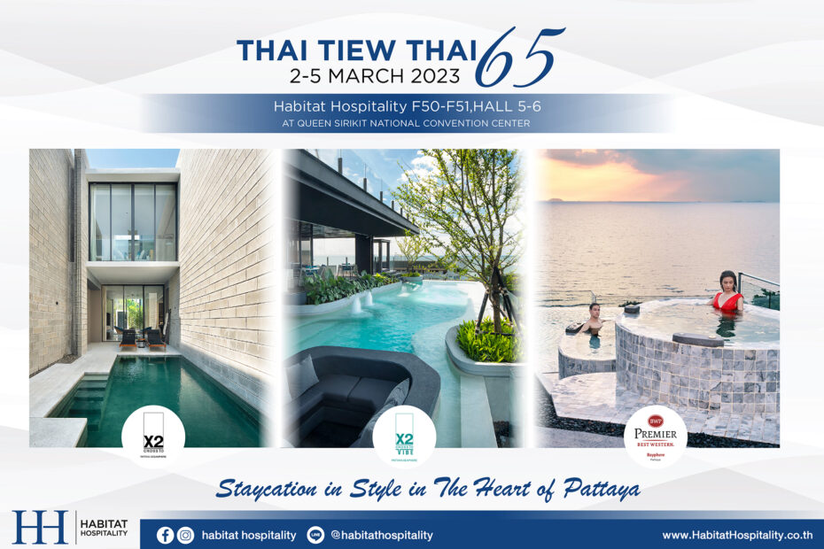 @ ฮาบิแทท ฮอสพิทัลลิตี้ ขอเสนอโปรโมชั่นสุดพิเศษเฉพาะในงาน “ไทยเที่ยวไทย ครั้งที่ 65” กับ 3 โรงแรมดัง 3 สไตล์ ใจกลางพัทยา ได้แก่ โรงแรมติดหาด เบสเวสเทิร์นพรีเมียร์ เบย์เฟียร์ พัทยา, ครอสทู พัทยา โอเชียนเฟียร์ ดีไซน์พูลวิลล่า และ ครอสทู ไวบ์ พัทยา ซีเฟียร์ พร้อมข้อเสนอสุดคุ้ม อาทิ ห้องพักพร้อมอาหารเช้า 2 วัน 1 คืน, ฟรีอัปเกรดห้องพัก, ส่วนลด 20% สำหรับอาหารและเครื่องดื่ม ห้ามพลาดรับของสมมนาคุณพิเศษเมื่อจองภายในงาน ตั้งแต่วันที่ 2-5 มี.ค. 66 (บูธเลขที่ F50-F 51) ณ ศูนย์การประชุมแห่งชาติสิริกิติ์ ฮอลล์ 5 – 6 สอบถามข้อมูลเพิ่มเติม https://lin.ee/wflqWBI