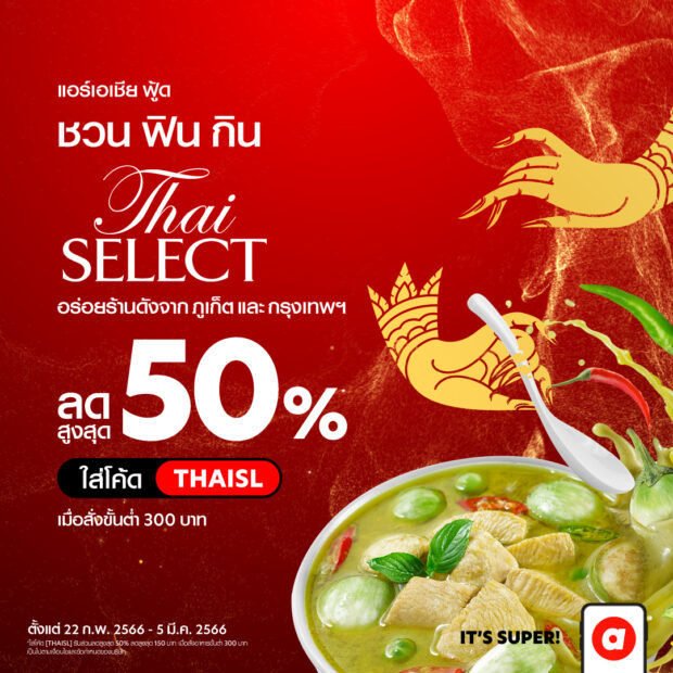 @ airasia Super App จับมือ กรมพัฒนาธุรกิจการค้า นำร้านอาหารไทยที่ได้รับตรา Thai SELECT ซึ่งเป็นเครื่องการันตีความอร่อยของร้านอาหารไทยที่มีอัตลักษณ์เด่นเฉพาะตัวในท้องถิ่นมาเสิร์ฟความอร่อยให้ลูกค้ากรุงเทพฯและนนทบุรีได้ลิ้มลอง พร้อมโปรโมชั่นส่วนลดสูงสุดถึง 50% เมื่อสั่งเมนู Thai SELECT จำนวน 22 ร้านผ่าน “airasia food” ระหว่างวันที่ 22 กุมภาพันธ์-5 มีนาคม 2566 (ยอดสั่งอาหารขั้นต่ำ 300 บาท / ไม่จำกัดสิทธิ์ต่อวัน)