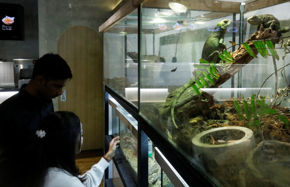 ลูกค้าหลายคนที่มาคาเฟ่ รวมถึงเด็ก ๆ ต่างอุ้มและลูบสัตว์มีเกล็ดเหล่านี้ ขณะสั่งเครื่องดื่มและอาหาร
