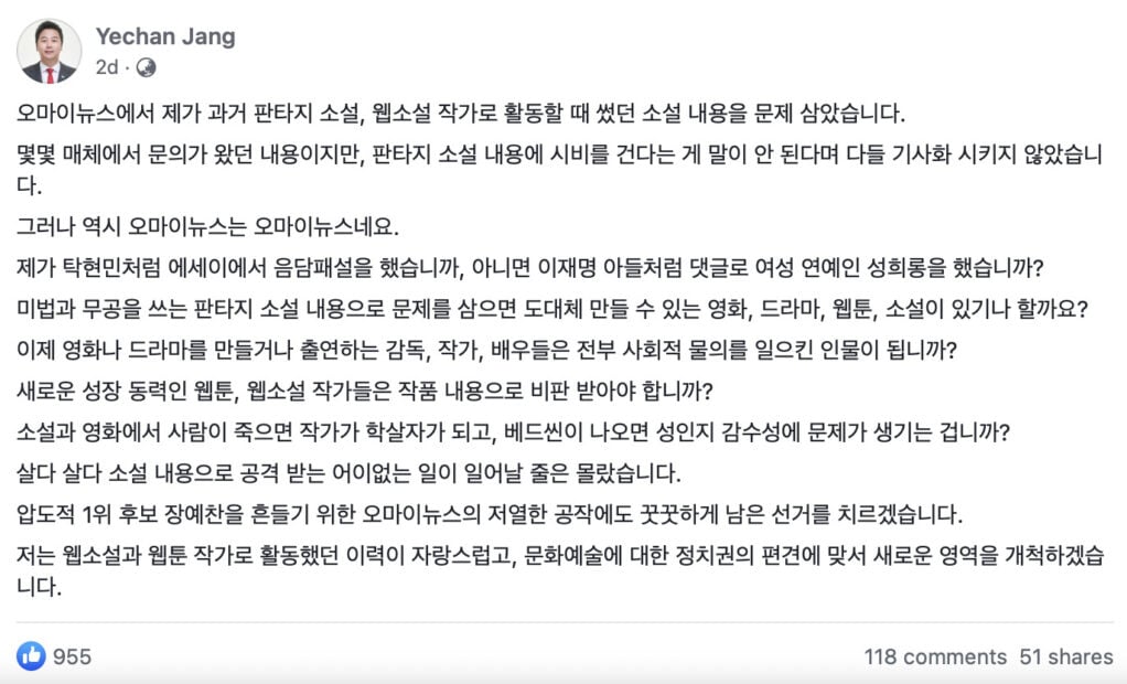 เมื่อวันที่ 26 ก.พ. 2566 จาง เย-ชาน นักการเมืองหนุ่มชาวเกาหลีใต้วัย 34 ปี ของฝ่ายอนุรักษนิยม PPP โพสต์เฟซบุ๊กระบายความในใจหลังจากที่มีคนขุดผลงานเมื่อหลายปีก่อนตอนที่เขายังเขียน ‘แฟน ฟิคชัน’ (นิยายที่สร้างเรื่องราวจากคนดังหรือตัวละครที่ผู้เขียนชื่นชอบ) เผยแพร่บนแพลตฟอร์มออนไลน์ โดยกล่าวหาว่าเขาใช้บุคลิกลักษณะของ ‘ไอยู’ นักร้องยอดนิยมของเกาหลีใต้ เป็นต้นแบบ