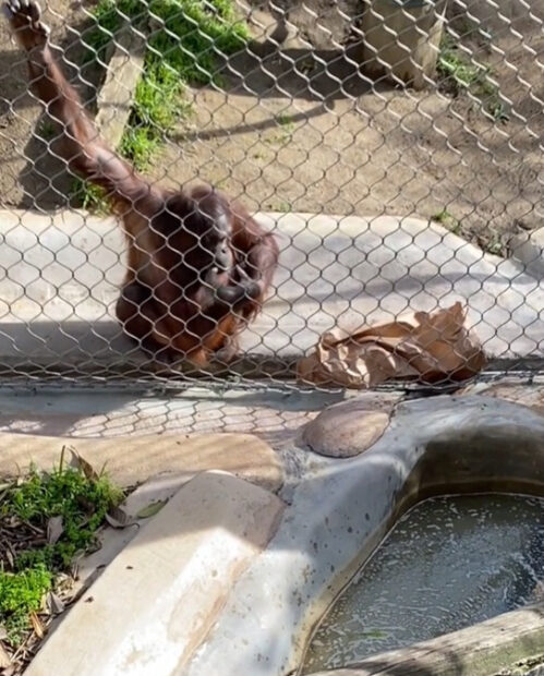 แต่ด้วยความที่มันห่างไกลจากกรงมาก จึงไม่สามารถหยิบได้ น้องอุรังอุตังก็หันไปเห็นกาบต้นไม้ก่อนหยิบมารอดห่วงผ่านรูรั้ว และค่อย ๆ เขี่ยขวดนมจนทำได้สำเร็จ พร้อมดูดโชว์ความเป็นเจ้าของทันที