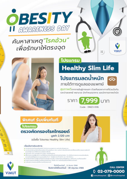 @ โรงพยาบาลวิมุต ต้อนรับวันอ้วนโลก พร้อมนำเสนอแพ็กเกจ “Obesity Awareness Day Healthy Slim Life” โปรแกรมลดน้ำหนักภายใต้การดูแลของแพทย์ในราคาเพียง 7,999 บาท รับเพิ่มโปรแกรมตรวจคัดกรองโรคไทรอยด์มูลค่า 2,120 บาท ทันที โดยไม่มีค่าใช้จ่ายเพิ่ม เพื่อให้ผู้ที่มีปัญหาโรคอ้วน สามารถลดน้ำหนักได้อย่างเห็นผล มีประสิทธิภาพและปลอดภัยมากที่สุด สอบถามรายละเอียดได้ที่ ชั้น 9 โรงพยาบาลวิมุต โทร. 0-2079-0070 ทุกวัน ในเวลา 07.00-19.00 น.