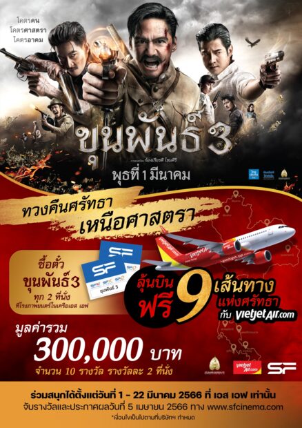 @ เอส เอฟ ร่วมกับ สหมงคลฟิล์ม และ สายการบินไทยเวียตเจ็ท จัดแคมเปญ “ทวงคืนศรัทธา เหนือศาสตรา บินลัดฟ้าไปเติมความขลังให้เต็มศรัทธา กับ ขุนพันธ์ 3 และ เวียตเจ็ท” เพียงซื้อบัตรชมภาพยนตร์เรื่อง “ขุนพันธ์ 3” ทุก 2 ที่นั่ง ที่โรงภาพยนตร์ในเครือ เอส เอฟ ทุกสาขา ตั้งแต่วันนี้-22 มีนาคม 2566 รับสิทธิลุ้นรับตั๋วเครื่องบินไป-กลับ 9 เส้นทางสายมู จำนวน 10 รางวัล รางวัลละ 2 ที่นั่ง (ไป-กลับ) จากไทยเวียตเจ็ท จาก 9 เส้นทาง ดังนี้ เชียงใหม่, เชียงราย, อุดรธานี, อุบลราชธานี, ขอนแก่น, นครศรีธรรมราช, หาดใหญ่, ภูเก็ต และ สุราษฎร์ธานี ประกาศผลรายชื่อผู้โชคดีในวันที่ 5 เมษายน 2566 ผ่านทาง www.sfcinema.com