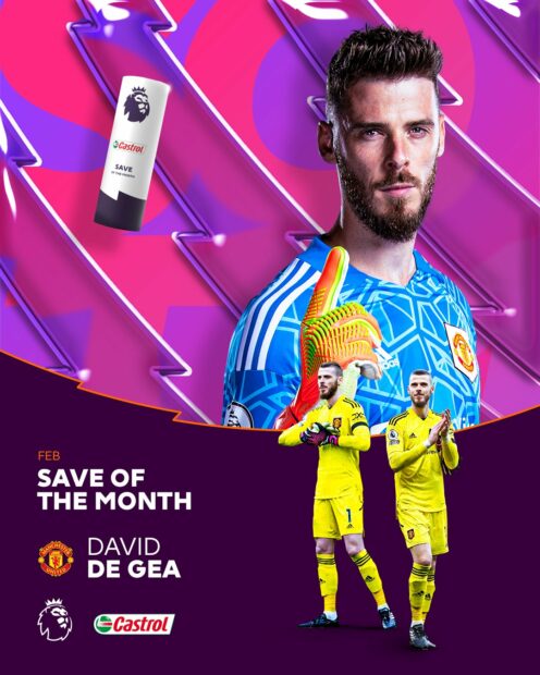 นอกจากนี้ ดา บิด เดอา นายทวารจอมหนึบ แมนฯ ยูไนเต็ด ก็ยังได้รับการโหวตให้คว้ารางวัลเซฟยอดเยี่ยมประจำเดือนก.พ.ไปครองอีกต่างหาก จากการโชว์ซูเปอร์เซฟควักลูกโขกของ เคเลชี อิเฮียนาโช ออกมาจากเส้นได้อย่างเหลือเชื่อในเกมชนะ เลสเตอร์ ซิตี 3-0 เมื่อวันที่ 19 ก.พ.ที่ผ่านมา.