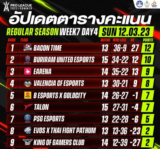 ศึกตีป้อมอีสปอร์ต “RoV Pro League 2023 Summer” รอบ Regular Season เสร็จสิ้นสัปดาห์ที่ 7 ไปเป็นที่เรียบร้อย ได้ 3 จาก 4 ทีมผ่านเข้าสู่รอบ Championship คือ “เจ้าหมู” Bacon Time ทีมจ่าฝูงตั้งแต่สัปดาห์แรกและครองยาว ๆ มาตลอด 7 สัปดาห์, “ปราสาทสายฟ้า” Buriram United Esports ทีมอันดับ 2 และ eArena ทีมอันดับ 3 นับเป็นการผ่านเข้ารอบ Championship เป็นครั้งแรกของ “กระต่ายคลั่ง”