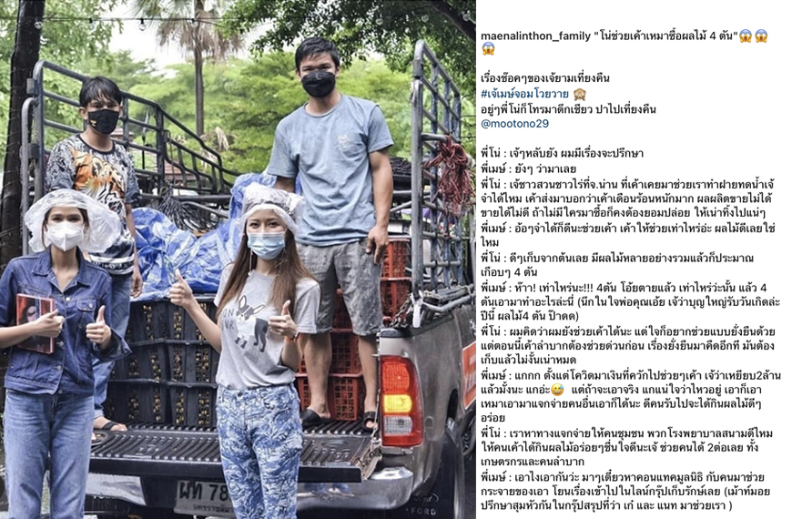 ถือเป็นอีกหนึ่งเรื่องราวดีๆ หลังล่าสุดผู้จัดการของนักแสดงหนุ่ม โตโน่ ภาคิน ที่ล่าสุดออกมาเผยเรื่องราวน่าประทับใจของหนุ่มโตโน่ ที่ตั้งใจจะเหมาผลไม้ 4 ตัน เพื่อช่วยเหลือเกษตรกรและนำไปมอบให้คนช่วงโควิด โดยผู้จัดการของหนุ่มโตโน่ลงรูปบรรยากาศตอนซื้อผลไม้ พร้อมข้อความเล่าว่า
