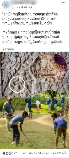 เมื่อวันที่ 18 มี.ค. ผู้สื่อข่าวรายงานว่า เพจเฟซบุ๊ก “World Forum ข่าวสารต่างประเทศ” โพสต์ภาพพร้อมข้อความ ระบุว่า กัมพูชา จุดก่อกำเนิดกีฬา พร้อมระบุว่า #เพจเขมร อธิบายการกำเนิดกีฬาหลายอย่างบนกำแพงนครวัด เป็นภาษากัมพูชา แปลเป็นไทยได้ว่า พวกเราชาวกัมพูชาหลายคนอาจเชื่อผิดๆ ว่า กอล์ฟมีต้นกำเนิดในยุโรป และแพร่หลายไปทั่วเอเชีย ในความเป็นจริงไม่มีใครอยากจะเชื่อว่าบนกำแพงนครวัด มีการแกะสลักอารยธรรมของชาวเขมรตั้งแต่สมัยโบราณ รวมถึงกีฬายอดนิยมหลากหลายประเภท เพื่อเฉลิมฉลอง ประเพณีของชาติ