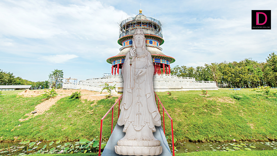 องค์พระโพธิสัตว์กวนอิมประทับยืนบนหลังพญามังกรนี้แกะสลักจากหยกขาวชิ้นเดียวที่ได้มาจากเหมืองในป่าลึกของเมืองนับปีตรู ประเทศเมียนมา โดย อุทิศ ชัยลือกิจ เป็นผู้บริจาคเนื้อหยกขาว จากนั้นจึงชักลากด้วยช้างและรถยนต์ เดินทางผ่านเข้าสู่ประเทศจีนทางด่านมูเซไปยังกรุงปักกิ่ง เมื่อแกะสลักสำเร็จเป็นที่เรียบร้อยแล้ว จึงบรรทุกโดยรถยนต์ลงมายังเมืองท่าเทียนสิน เพื่อเดินทางโดยเรือเดินทะเล มาขึ้นที่ท่าเรือแหลมฉบัง ประเทศไทย ในวันที่ 14 สิงหาคม 2557