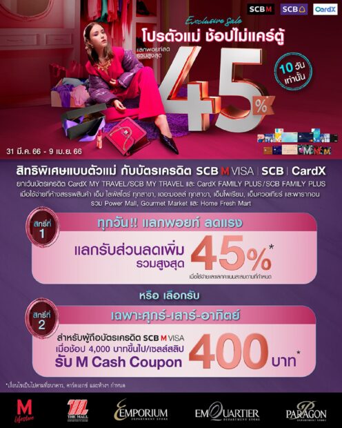 @ เดอะมอลล์ จับมือ เอ็ม ไลฟ์สโตร์ ทุกสาขา, ดิ เอ็มโพเรียม, ดิ เอ็มควอเทียร์ และ พารากอน ร่วมกับ ธนาคารไทยพาณิชย์ และ บริษัท คาร์ด เอกซ์ จำกัด มอบโปรโมชั่นสุดเอ็กซ์คลูซีฟ “SCB Exclusive sale โปรตัวแม่ ช้อปไม่แคร์ตู้” ระหว่างวันที่ 31 มีนาคม-9 เมษายน 2566 พิเศษสุดสำหรับสมาชิกบัตร M Card ที่ใช้จ่ายผ่านบัตรเครดิต SCB M VISA, บัตรเครดิต SCB และบัตรเครดิต CardX ช้อบสนุกทุกวันกับการแลกพอยท์รับส่วนลดรวมสูงสุด 45% หรือเฉพาะศุกร์-อาทิตย์ ช้อปครบรับเลย M CASH COUPON มูลค่า 400 บาท เมื่อช้อปภายในห้างฯ ครบตามที่กำหนด