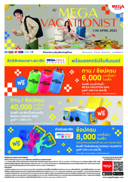 @ เมกาบางนา ให้คุณช้อปกับแคมเปญ “MEGA VACATIONIST” ตั้งแต่วันที่ 1-30 เมษายน 2566 สำหรับสมาชิก เมกา สไมล์ รีวอร์ดส และ เมกา สไมล์ คิดส์ เพียงทาน/ช้อปครบ 6,000 บาท รับฟรี! กระเป๋า Mega Vacation Bag กระเป๋ากันน้ำสีสันสดใสท้าแดด หรือ ทาน/ช้อปครบ 40,000 บาท รับฟรี! Mega Cooler Box กระติกเก็บความเย็นมูลค่า พิเศษ! สำหรับสมาชิกเมกา สไมล์ คิดส์ เมื่อ ช้อปครบ 8,000 บาท ในร้านค้าหมวดแม่และเด็ก และ เมกา สมาร์ท คิดส์ รับฟรี! ปืนยิงฟองสบู่ BUBBLE BLASTER ทั้งนี้ เมื่อใช้จ่ายผ่านบัตรเครดิตที่ร่วมรายการ แลกรับเครดิตเงินคืนได้สูงสุด 15% ดูรายละเอียดเพิ่มเติม www.mega-bangna.com
