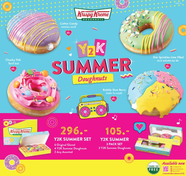 @ คริสปี้ ครีม ชวนคุณย้อนยุคไปกับหน้าร้อนสีสันสดใสโดนใจของ “Y2K Summer Doughnuts” กับโดนัทเนื้อนุ่มสีพาสเทลสดใส 4 สไตล์ เริ่มที่ “Chocky Pink” วิปครีมวอเตอร์เมลอน โรยสปริงเคิลส์และช็อกโกแลตหลากสี ต่อด้วย “Cotton Candy” ความอร่อยของไส้คอตตอนแคนดี้ครีมเต็มคำ “Star Sprinkles Lime Filled” โดนัทฟิล ริง สีเขียวละมุน สอดไส้เลมอนไลม์ครีม ปิดท้ายกับ “Bubble Gum Berry” โดนัทเคลือบช็อกโกแลตสีฟ้า เหลือง และชมพู สอดไส้มิกซ์เบอร์รี่ครีม ในราคาเพียงชิ้นละ 35 บาท พร้อมกล่องคัลเลอร์ฟูลสุดลิมิเต็ด ตั้งแต่วันนี้-9 พฤษภาคม 2566 ณ ร้านคริสปี้ ครีม กว่า 50 สาขา ติดตามรายละเอียดได้ที่ www.krispykreme.co.th