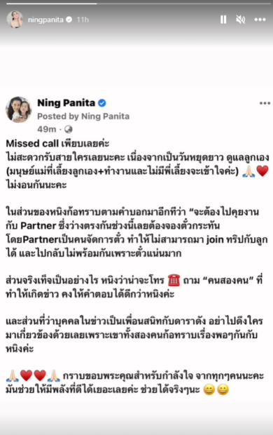 ล่าสุดเมื่อวันที่ 16 เมษายน หนิงปณิตาได้ออกมาเคลื่อนไหวเกี่ยวกับประเด็นดังกล่าว โดยระบุว่า “Missed call เพียบเลยค่ะ ไม่สะดวกรับสายใครเลยนะคะ เนื่องจากเป็นวันหยุดยาว ดูแลลูกเอง (มนุษย์แม่ที่เลี้ยงลูกเอง+ทำงานและไม่มีพี่เลี้ยงจะเข้าใจค่ะ) ไม่งอนกันนะคะ