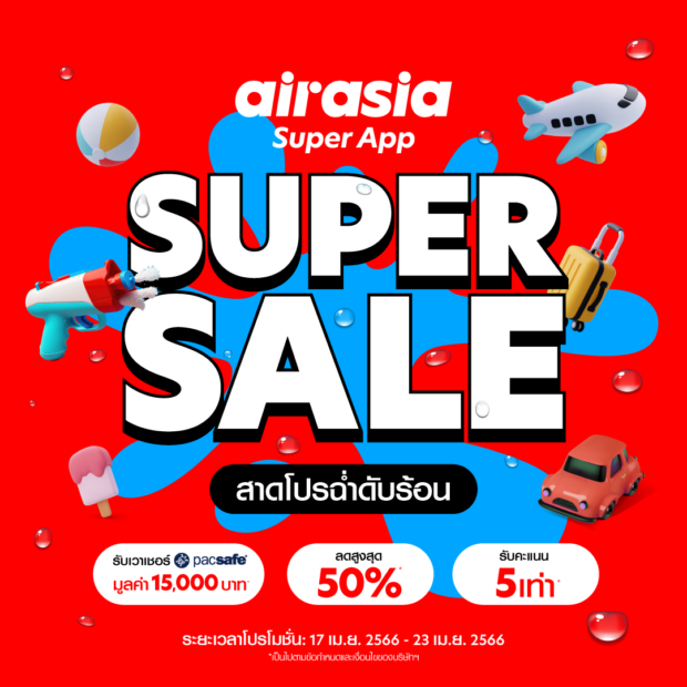 @ airasia Super App สานต่อความสำเร็จของ “Super App Super Sale” ด้วยโปรฮอต ซัมเมอร์เดือด! แจกจุกประจำเดือนเมษายนลดทั้งแอปสูงสุด 50% พร้อมรับ airasia points 5 เท่าจากการซื้อสินค้าและบริการบน airasia Super App สำหรับสมาชิกแอร์เอเชีย ตั้งแต่วันที่ 17-23 เมษายน 2566 พร้อมชิงบัตรกำนัลของขวัญจาก Pacsafe มูลค่า 15,000 บาท ติดตามข่าวสารล่าสุดรายละเอียดได้ที่ https://www.facebook.com/flyairasia.th